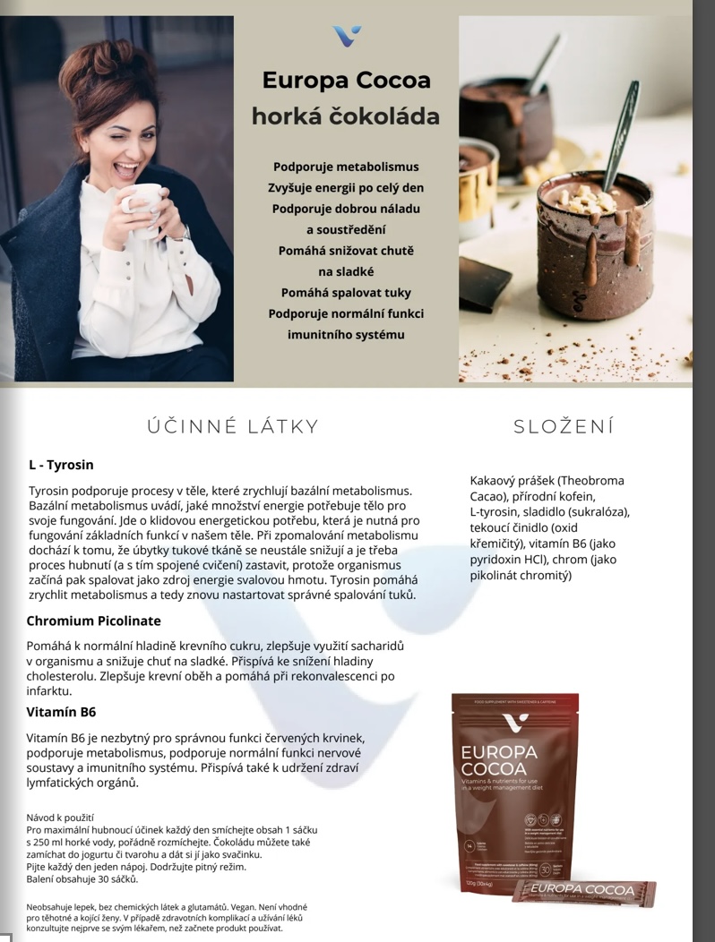 Kakaový prášek (Theobroma Cacao), přírodní kofein, L-tyrosin - 400mg, sladidlo (sukralóza), roztoková látka (oxid křemičitý), vitamin B6 (jako pyridoxin HCl), chrom (jako pikolinát chromu).