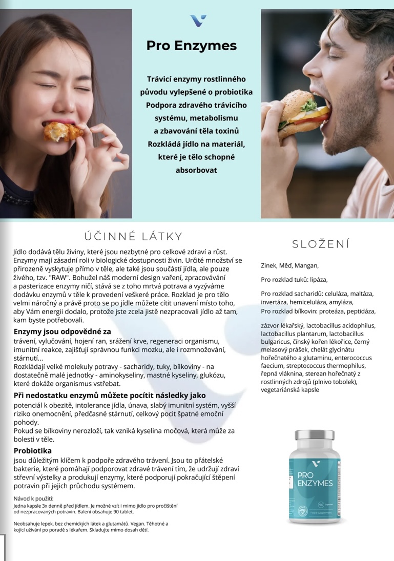 Směs enzymů, kapsle Shell HPMC (hydroxypropylmethylcelulóza), prášek z červené řepy, bisglycinát hořečnatý, bisglycinát zinečnatý, prášek z kořene zázvoru, protispékavé látky (stearan hořečnatý), melasa z černého řemínku, kořen lékořice čínské, bisglycinát manganu, bisglycinát mědi, Lactobacillus Bulgaricus, Lactobacillus Plantarum, Entercoccus faecium, Streptococcus Thermophillus