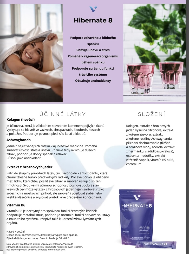 Kolagen (HOVĚZÍ), výtažek z hroznových semínek (Vitis vinifera 95%) proanthokyanidiny 200:1-sulfitů), kyselina (kyselina citronová), zázvor extrakt z kořene (Zingiber Officianalis 20:1), kořen Ashwaghanda (Withania Somnifera 5:1), barvivo (extrakt z hroznového vína), Přírodní aromata (třešňové a hroznové), plod třešně Acerola extrakt (Malphigia emarginata), extrakt z květů heřmánku pravého (Matricaria recutita 10:1), sladidlo (sukralóza), meduňka lékařská extrakt z listů (Melissa Officianalis 4:1), plody třešně Montmorency (Prunus Cerasus), vápník (citrát vápenatý), objemové látky (dextróza), vitamín B5 (panthotenát vápenatý), vitamín B5 (dextróza), vitamín B5 (dextróza) B6 (pyridoxin HCl), chrom (pikolinát chromitý)